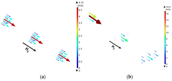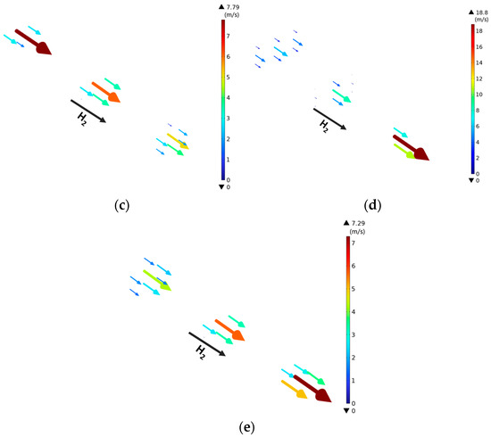 The streamlines of hydrogen flow are presented in Figure 16 for the single channel operated at an operating voltage 1.4 V for various channel designs, aiming to better understand the impact of channel structure changes on the velocity distribution. Figure 16a illustrates the streamlines predicted for the traditional channel, where higher velocities are predominantly concentrated in the channel central part, and the velocity remains constant along the main flow direction for which the streamline in the inlet and outlet regions is consistent. The streamlines for case-1 and case-2 (i.e., the channel expanded in the width or thickness direction) are depicted in Figure 16b,c. In both cases, the high velocities are predominantly observed in the inlet region and gradually decrease along the main flow direction until a minimum one is observed in the outlet region, which can be attributed to the fact that the channels in the inlet region are narrower compared to those in the outlet region. Figure 16d,e illustrates the streamlines of case-3 and case-4 (i.e., the channel shrinking in the width or thickness direction), and it is clear that completely opposite results are observed compared to those for case-1 and case-2. This discrepancy is attributed to the entirely opposite structural configurations.