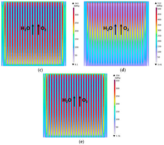 Von Mises stress predicted on the electrolyte surface at operating voltage 1.4 V for (a) case-0 with traditional rib/channel; (b) case-1 with channel expanding in width direction; (c) case-2 with channel expanding in thickness direction; (d) case-3 with channel shrinking in width direction; (e) case-4 with channel shrinking in thickness direction.