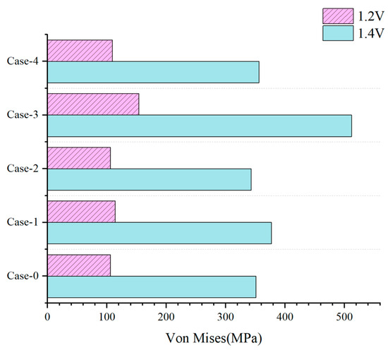 As shown in Figure 18, the maximum thermal stresses predicted for all the cases (except case-3) are similar to one another. If the electrolysis working voltage is 1.4 V, the configuration of the gradient channels has more influence on the maximum von Mises stress than that under the operating voltage of 1.2 V. It is also true that the maximum von Mises stress in case-3 is the highest, and increases by approximately 45.9% compared with that in case-0. This finding is the same observed for the temperature difference between the highest and lowest values identified in Figure 15.