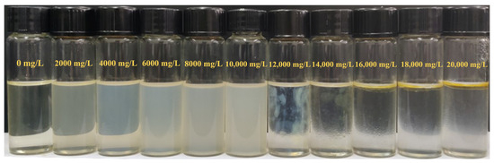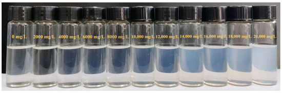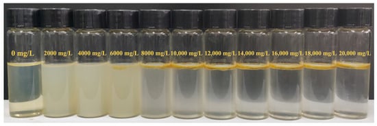Salt dissolution experiments were conducted to verify the surfactants’ ability to resist metal ions under conditions of gradually increasing salinity, where the salt concentration range was 0–20,000 mg/L and the interval gradient was 2000 mg/L. The solubility of surfactants in water can be reduced by the addition of NaCl. With the increase in NaCl content, surfactants will precipitate from the aqueous solution and form a new phase, based on which the salt tolerance of surfactants can be judged. The salt solubility of LBAS is shown in Figure 2.