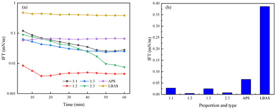 As can be seen from Figure 5, the reduction interfacial tension caused by a single LBAS solution or APS solution is not significant enough. The final IFT can only reach a level of 10−1 or 10−2 mN/m, which does not meet the actual requirements for surfactants to reduce interfacial tension in the field. Therefore, the synergistic effect of different proportions of an anionic surfactant and anionic–nonionic surfactant was studied.