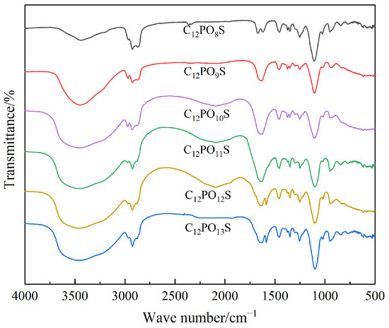 The analysis shows that all the infrared spectra are similar, because LBAS has the same functional group, so the absorption peaks are also similar. In addition, due to the different numbers of POs, each absorption summit has a slight deviation. The six products have stretching vibrations of C-H at 3400 cm−1 and 2900 cm−1, bending vibrations of C-H at 1450 cm−1, and stretching vibrations of C-O-S at 1255 cm−1. There is an antisymmetric stretching vibration of C-O-C at 1108 cm−1 and an antisymmetric stretching vibration of S=O at 1025 cm−1 and 780 cm−1.
