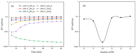 It can be seen from Figure 7a that the IFT of C12PO8–10S decreases with the increase in the number of PO groups, while the IFT of C12PO10–13S gradually increases with the increase in the number of PO groups. Among them, the equilibrium IFT of C12PO10S is the lowest, due to the extension of the length of the molecule after the proper number of PO groups are inserted into the molecule, which enhances the interaction between the hydrophobic chain and the oil phase. This is beneficial to the reduction in IFT and the PO group has certain hydrophobicity. From Figure 7b, it can be more intuitively observed that the equilibrium interfacial tension shows a “V” shape variation with the increase in the number of PO groups [22]. When the LBAS and C12PO10S are mixed, the interfacial tension reaches its lowest, reaching the order of 10−3 mN/m, which suggests ultra-low interfacial tension. Professor Salager’s research team [23,24] believes that the first 2–3 PO groups in the surfactant structure are likely to hydrate and aggregate near the oil–water interface, which will shorten the effective chain length. Chen et al. [12] pointed out that with the increase in PO numbers, the crimped PO chains occupy more space at the interface, which can be attributed to the disordered conformation of PO groups. When the two surfactants are closely arranged at the oil–water interface and the hydrophilic chain head groups and hydrophobic chain ends occupy almost the same volume, it is favorable to replace the solvent molecules at the interface and reduce the interfacial tension [25]. When the PO number is 10, the size of the PO chain matches the size of the anion head, which can achieve an ultra-low IFT.