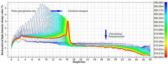 As shown in Figure 9, the intensity of the backscattered light from the upper part of the bottle gradually decreases over time, indicating that flocculation or agglomeration of the upper emulsion occurs and that the upper part gradually appears in the pure oil phase. Over time, the intensity of transmitted light in the lower part of the bottle gradually increases, which indicates that the lower part of the bottle begins to gradually clarify and appears in the pure water phase. The peak intensity of backscattered light occurs when the emulsion begins to flocculate and coalesce. The peak value of backscattered light gradually shifted to the middle of the bottle, indicating that as the volume of the pure water phase increased, the volume of the emulsion decreased, and transferred to the middle of the sample bottle. The distance between the backscattered light intensity variation curves represents the pace at which water precipitates from the emulsion. The larger the distance between the curves, the faster the water precipitates from the emulsion.