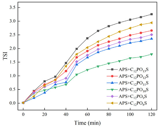 As can be seen from Figure 10, with the increase in the number of PO groups in the complex system, the TSI index first decreased and then increased, indicating that the stability of the emulsion first increased and then decreased. The TSI index of C12PO8–10S decreases with the increase in PO group number, indicating that the stability of the emulsion increases with the increase in PO group number. The TSI index of C12PO10–13S increased with the increase in the number of PO groups, indicating that the stability of the emulsion decreased with the increase in the number of PO groups. At this time, C12PO10S had the smallest TSI index and the best stability of the emulsion. This is because the inclusion of the proper number of PO groups in the molecule extends the length of the molecule, thus enhancing the interaction between the molecular hydrophobic chain and oil, and the spatial matching degree of C12PO10S is the highest, resulting in the interfacial film having the maximum strength. Therefore, the emulsion has the best stability and shows the same change rule as the interfacial tension [33]. The more tightly the surfactant molecules are packed into the oil–water interface, the more force there is between the surfactant, water, and oil molecules. As a result, the oil–water interface layer is thicker, the interface film is stronger, and the emulsion is more stable.