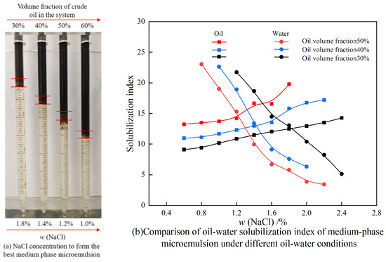 As shown in Figure 11, the sodium chloride concentration corresponding to the intersection of the oil–water solubilization index curves represents the optimum salt content of the system. As the crude oil content in the system increases, the optimum salt content decreases. From the above research results, it can be seen that the compound surfactant system can form a Winsor Ⅲ microemulsion with crude oil.