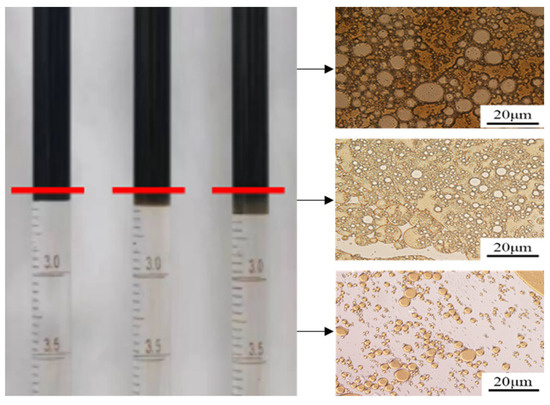 According to the phase experimental results, the system has the characteristics of Winsor Ⅲ emulsion, but the volume of the mesophase is relatively small, as was confirmed. At the upper, middle, and lower positions of the system with 1.2% NaCl concentration, a certain amount of liquid was extracted, and the particle size and type of liquid were observed under a microscope. From the results in Figure 12, it can be seen that the liquid at the middle position is characterized by an obvious bicontinuous phase with both W/O-type and O/W-type structures. This indicates that the addition of the composite surfactant caused unidirectional bending at the oil–water interface, resulting in the formation of a stable bicontinuous phase.