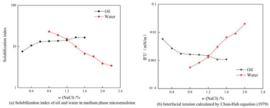 Figure 13 shows the experimental results of phase behavior under an oil–water ratio of 5:5. It can be seen from Figure 13a that the oil–water solubilization index is higher than 10 in the salt concentration range of the middle-phase microemulsion, and the optimum salt content of the middle-phase microemulsion is 1.2%. The oil–water interfacial tension, calculated according to Formulas (3) and (4), reaches the ultra-low order of 10−3 mN/m, as shown in Figure 13b.