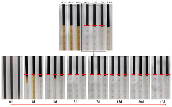 Based on the research results of the effects of different oil–water ratios and NaCl concentrations on the Winsor Ⅲ microemulsion, the stability of the Winsor Ⅲ microemulsion was further evaluated, as shown in Figure 14.