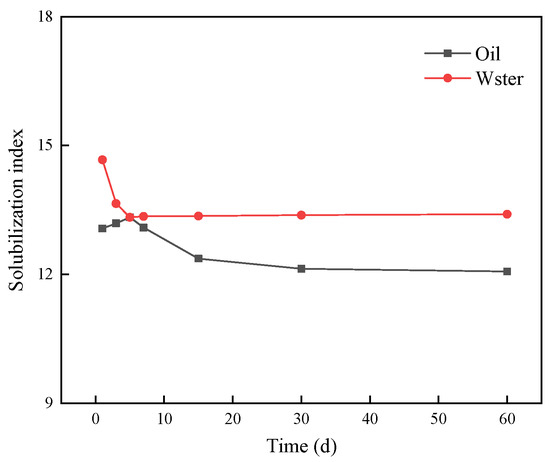 At the beginning of the preparation of the system (day 0), oil and water were fully mixed to form an emulsion. Due to the instability of the emulsion, the oil phase and water phase gradually precipitated with over time at the end of the first day, and finally, three coexisting oil–microemulsion–water phases appeared. Further observation of the volume of the microemulsion in the pipette showed that the volume of the Windsor III microemulsion changed very little. This indicates that the Windsor III microemulsion, made by mixing the complex surfactant with oil at a salt concentration of 1.2%, has good stability. The stability of the middle-phase microemulsion was further observed using the curve of the relationship between the solubilization index of oil and water and time (days) (Figure 15).