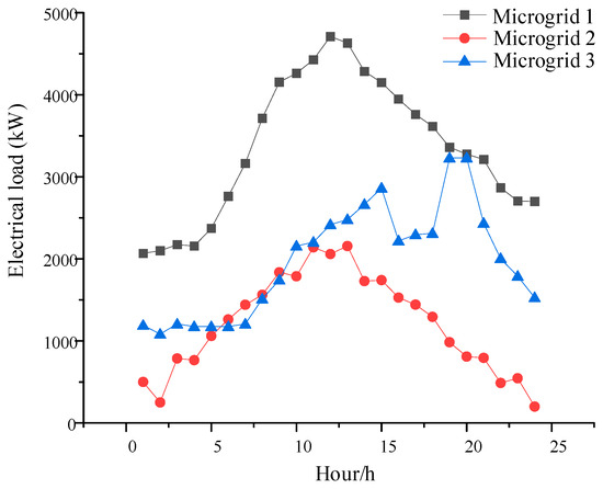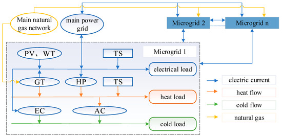 Assuming each microgrid can engage in the buying and selling of electric energy with the main power grid and purchase natural gas from the main natural gas network, microgrids are interconnected through power interconnection lines, enabling real-time point-to-point sharing of electric energy transactions. A set of multiple microgrids is defined as , N microgrids. Simultaneously, the optimization periods are defined as , where the optimization period spans 24 h, and optimization is conducted every hour. Therefore, T = 24.