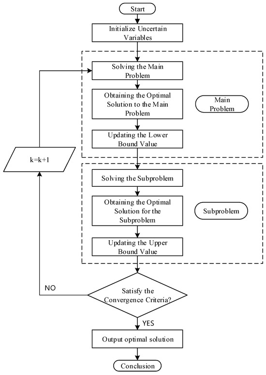In summary, the MP and SP models for Equation (52) alternate in solving through iterations and variable updates via Equations (53), (54) and (56) until a predetermined accuracy is achieved, concluding the iterative process. Through continuous iteration and updating, the problem can be gradually optimized, approaching the optimal solution.