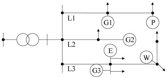 In the example of a nine-node microgrid system, the electrical system decomposition diagram is illustrated in Figure 3. The microgrid system comprises wind turbines (W), photovoltaic devices (P), gas turbines (G), and energy storage (E).