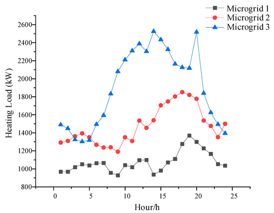 In the text, the price deviation coefficient () is set to 0.1; the electricity price uncertainty parameter () is set to 5; the confidence intervals for wind and solar uncertainties are set at α = 0.95 and β = 0.99, respectively. The natural gas price is assumed to be 2.2 CNY/m3 in the Jiangsu region, with a heating value of 9.7 kW·h/m3. The power for buying and selling electricity between microgrids and the main grid is set at ±2000 kW, and the power for energy sharing among microgrids is ±2000 kW. The main parameters of each device and the node parameters of the microgrid can be found in references [8,21,24].
