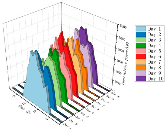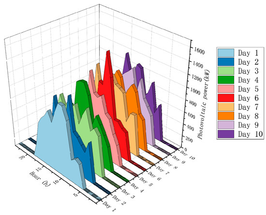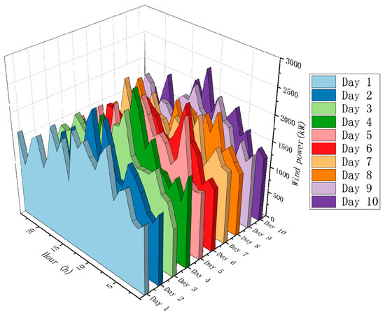 To validate the feasibility and effectiveness of the proposed model, three microgrids are taken as examples. Table 1 provides the retail electricity price and grid electricity price of the main grid. The electric, heating, and cooling loads of the three microgrids are illustrated in Figure 4, Figure 5 and Figure 6, respectively. Microgrid 1 exclusively considers wind power generation as the form of renewable energy, while microgrids 2 and 3 exclusively consider solar power generation (with different solar resources for the two microgrids). Figure 7, Figure 8 and Figure 9 illustrate the generation resources of renewable energy within each microgrid, simulated using a dataset spanning 10 days. At different time points, surplus energy can be mutually utilized through complementary means. By employing game theory and profit distribution mechanisms, collaborative scheduling among multiple microgrids is realized to optimize energy utilization efficiency and system performance.