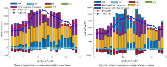 Figure 11 shows that after electricity sharing, there is a significant increase in shared electricity compared to before sharing, with a focus on the period from 07:00 to 17:00. This concentration is due to the fact that the renewable energy source of the other two microgrids is photovoltaic power generation, and during periods of high photovoltaic generation in these microgrids, shared electricity is absorbed to enhance the efficiency of renewable energy utilization. Simultaneously, this practice significantly reduces the amount of electricity purchased from the main grid. The price-based electricity load demand response plan involves shifting the transferrable electrical load from high-price periods to low-price periods. Calculated using Formula (19), Microgrid 1 is projected to save ¥1472.06 by implementing this price-based electricity load demand response plan. During the fixed load phase, Microgrid 1 adopts a strategy to reduce electricity purchases and increase gas turbine power generation during high−price periods to counteract the high cost of electricity purchases. Based on grid selling prices, shared electricity costs, along with its own electricity load, and renewable energy output, Microgrid 1 adjusts the distribution of its electrical load to achieve the optimal state of electrical energy output. Energy storage primarily charges during low-price periods and discharges during high-price periods.