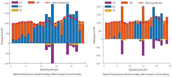 Comparison of heating power dispatch optimization results before and after microgrid 1 electric power sharing.
