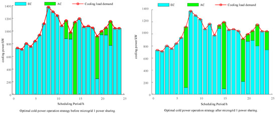 Comparison of cooling power dispatch optimization results before and after microgrid 1 electric power sharing.