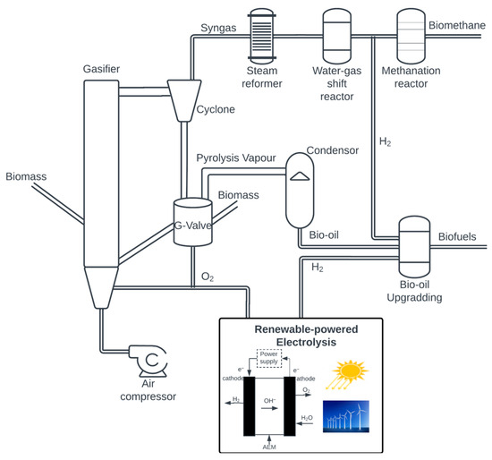The syngas generated from biomass gasification is then separated from the solids (uncombusted biomass, char, and sand) in the cyclone. The solids, which still carry heat, are directed to the G-Valve (pyrolyzer), where the sensible heat of the solids is used to support the endothermic pyrolysis reaction and to generate pyrolysis vapor. After the cooling process within a condenser, the pyrolysis vapor becomes liquid bio-oil, which will be further upgraded to biogasoline or biodiesel within the hydrotreatment reactors in the presence of hydrogen. Meanwhile, the syngas, after the cyclone, will go through a reformer and a two-stage water–gas shift reactor to enhance hydrogen generation. Then, the existing carbon monoxide and dioxide in the syngas, together with the generated hydrogen, will be sent to the methanation reactor for biomethane generation. The production of hydrogen through electrolysis, powered by renewable energy, is proposed to support the bio-oil hydrotreatment process and enhance biofuel production by facilitating the generation of biomethane. Furthermore, the oxygen from electrolysis is used to partially replace the air necessary for gasification, thereby improving the purity of syngas concentration.
