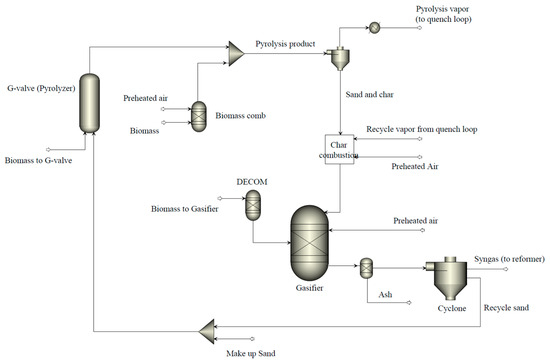 Process flowsheet of biomass pyrolysis integrated with gasification process in Aspen Plus.