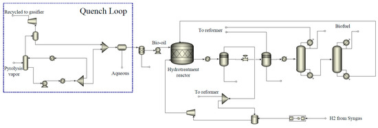 After the quench loop, bio-oil is separated with the aqueous phases from the pyrolysis product. To enhance the stability and heating value of the bio-oil, a hydrotreatment process is employed after the quench loop. Hydrotreating is a complicated process in the oil refinery process. Pyrolysis oil derived from biomass usually contains higher oxygen content compared to crude oil, which results in higher energy and hydrogen consumption [38]. In this work, the hydrotreatment parameters and reactions involved in the simulation of the pyrolysis hydrotreating process are primarily taken from the report published by the U.S. National Energy Technology Laboratory [39]. However, the outcomes can differ in actual applications due to the varying compositions of bio-oil and the operating conditions of the reactor. The hydrotreatment reactions and operating parameters employed in the Hydrotreatment Reactor block are enumerated in Table 2. The product resulting from the hydrotreatment process is directed to the distillation column, where biofuel is separated and produced. It is worth noting that the hydrogen required for bio-oil upgrading is from the gasification and renewable-powered electrolyzer process, which enables onsite self-sufficient hydrogen generation.