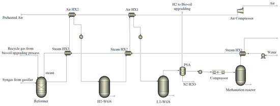 As presented in Figure 4, to enhance the biofuel production of the pilot plant, syngas produced from the gasification process is mixed with the recycled gas from the bio-oil upgrading process and directed into the steam reformer to increase hydrogen production. To further increase hydrogen generation, a two-stage water–gas shift reactor (high-temperature water–gas shift reactor, HT-WGS, and low-temperature water–gas shift reactor, LT-WGS) is incorporated after the reformer. Subsequently, in the pressure swing adsorption (PSA) process, a portion of the hydrogen is diverted to the bio-oil upgrading process. At the same time, the remaining gas (primarily composed of H2, CO, and CO2) is compressed and channeled to the methanation reactor to produce biomethane, aiming for enhanced biofuel production and carbon capture and utilization. Additionally, air preheating and high-temperature steam generation are also implemented into the process to improve the thermal efficiency of the entire pilot plant.