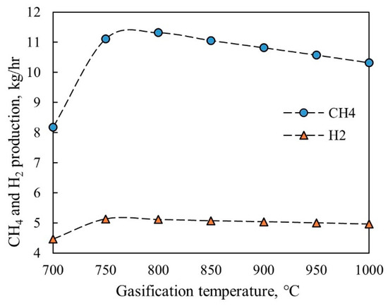 As aforementioned, the pyrolysis and gasification processes are coupled in the polygeneration plant by taking the heat from the recycling sand to support the endothermic pyrolysis process. The uncombusted solid left from the pyrolysis is then recycled back to the gasifier to participate in the gasification process. Therefore, the operating conditions of the gasifier have a major impact on the downstream processes, such as bio-oil production and hydrogen and biomethane generation. A sensitivity analysis is then performed in this work to investigate the impacts of the operating temperature of the gasifier on the hydrogen and methane production of the proposed system. Figure 6 shows the methane production (after the methanation reactor) and hydrogen yield (after the LT-WGS reactor) when the gasification temperature varies from 700 to 1000 °C. As illustrated in Figure 6, CH4 and H2 production increases when the gasification temperature rises from 700 to 800 °C, after which the CH4 and H2 yields start to drop if the gasification temperature is further increased from 800 to 1000 °C. While gasification benefits from the higher temperature, a larger portion of air is required to support the higher operating temperature through combustion, thus resulting in reduced CO, H2, and CH4 in the syngas composition, and eventually causing a drop in H2 and CH4 production after the WGS reactor and methanation reactor.