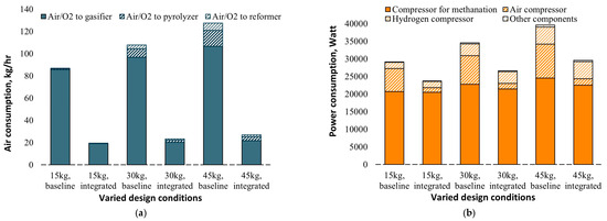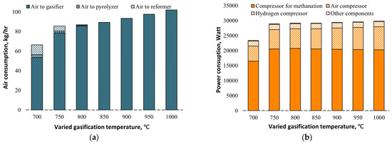 Air and power consumption of the polygeneration system under varied operating gasification temperatures are summarized in Figure 7. As we discussed before, more air is injected into the gasifier to maintain a higher gasification temperature, which contributes to the increase in air consumption. As also shown in Figure 7a, in the case of gasification temperatures lower than 800 °C, the heat carried by the recycled sand is not enough to support the endothermic reaction; therefore, part of the air is feeding into the pyrolyzer to support the pyrolysis process. The same happens in the steam reformer reactor; part of the air is injected into the reformer to supply the heat (so-called auto-thermal reforming) when the gasification temperature is lower than 80 °C. Figure 7b demonstrates the power consumption of the polygeneration plant under different operating conditions. As shown in Figure 7b, more than half of the power consumption comes from gas compression for the methanation. The methanation reactor operates at high pressures above 30 bars (as shown in Table 3), which consumes a large amount of power to pressurize the syngas before feeding into the methanation reactor. The second largest power consumption in the system is from the hydrogen compressor, as shown in Figure 7b. A hydrogen compressor is employed to compress the hydrogen (generated from the gasification, reforming, and water–gas shifting process) to the operating pressure (40 bar) of the bio-oil hydrotreatment reactor, therefore resulting in a large proportion of power consumption.