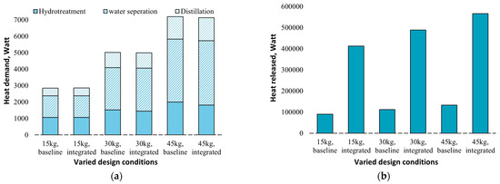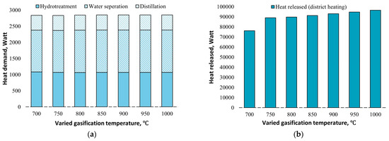 Heat requirements and the heat produced in the polygeneration plant are described in Figure 8. The heat demand comes mainly from the bio-oil upgrading processes, such as the hydrotreatment process, water separation, and distillation process, which are about 2.8 kW. The operating conditions of the gasifier hardly affect the bio-oil production process, thus resulting in the nearly constant heat requirement with varied gasification temperatures, as shown in Figure 8a. Figure 8b shows the changes in heat production in the polygeneration plant; as more combustion is required to support the higher operating gasifier operating temperature, more heat is released from the system, approximately 9–10 kW, which provides an opportunity for use as district heating.