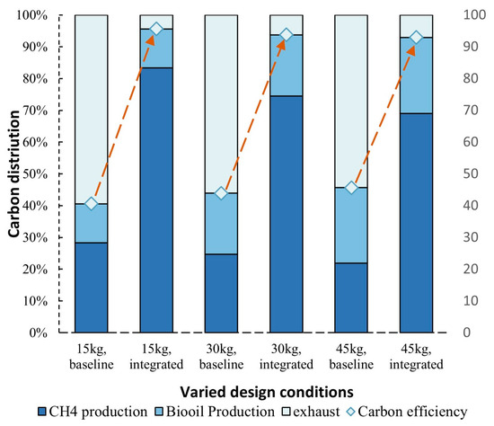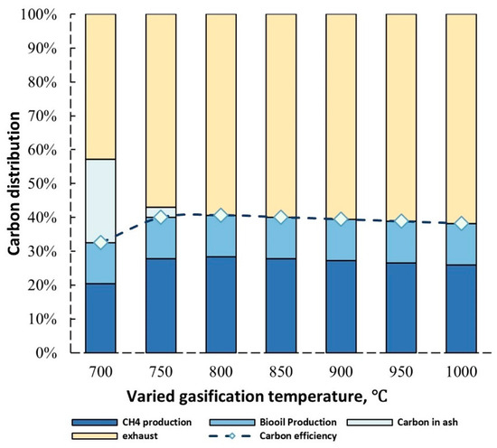 Figure 9 shows the carbon distribution and carbon efficiency of the polygeneration system under varied gasification temperatures. Carbon efficiency represents the proportion of carbon that has been converted into biofuels from the feedstock. As shown in Figure 9, approximately 40% of the carbon from the biomass could be captured in biomethane and bio-oil. The optimal gasification temperature in terms of the highest carbon efficiency (approximately 40%) is 800 °C. It is also worth noting that a large proportion of carbon is left in the ash when the operating temperature of the gasifier is lower than 750 °C, which is not favorable.