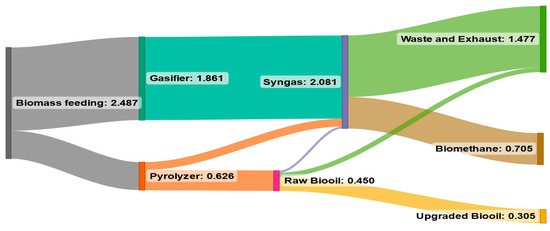 Figure 10 illustrates the carbon flows in the polygeneration system in the case of the 800 °C gasification temperature. More than half of the carbon is still released into the atmosphere through waste and exhaust in this case.