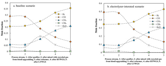 Molar concentration at varied locations in the process line for the baseline (a) and electrolyzer-integrated (b) scenarios.