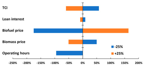 A set of key input variables including biofuel selling cost, biomass cost, loan interest rate, TCI, and operating hours for the plant are selected in the sensitivity analysis with values changed by a factor of ±25% [53]. The results of sensitivity analysis on the effects of important parameters on net present value are illustrated in Figure 17. The sensitivity analysis results show that the biofuel selling price has the most significant impact on the profitability of the system. Similarly, operating hours and biomass prices also have an obvious influence on the economic performance of such systems, while the loan interest has a lesser impact on the profitability of the polygeneration system. The sensitivity analysis results also imply the importance of uncertainty analysis in future work.