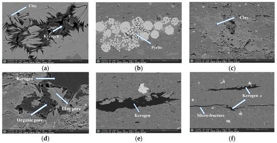 Combined with the argon ion-beam milling technique, scanning electron microscopy (SEM) was used to characterize the pores at nanometer resolution. Nano- and micro-scale pores were identified and analyzed based on SEM images. Some representative images are shown in Figure 2. Various minerals such as quartz, clay, kerogen, dolomite, and pyrite were observed from the SEM images. The pore type includes intergranular pores, intragranular dissolution pores, clay mineral pores, organic matter pores, and micro-fractures. It can be seen from the images that the organic matter and clay minerals are mixed, and there are large pores or micro-fractures on the edge of the kerogen. Some of the kerogen has a certain degree of pore development inside.