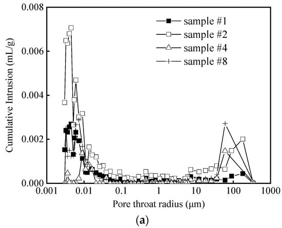 Pore-size distribution of tested samples: (a) Pore throat radius distribution measured by the mercury injection test. (b) Pore diameter distribution measured by the N2 adsorption test.