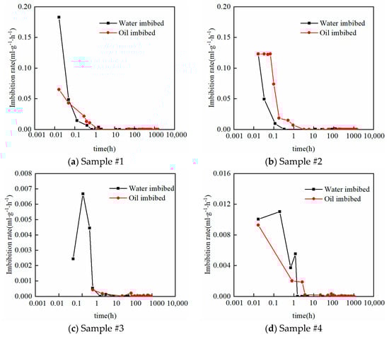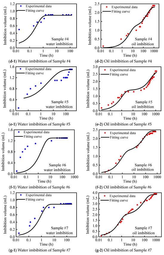 The vacuum-imbibition results of the shale samples are shown in Figure 4. The vacuum-imbibition curves of the oil and water show the following characteristics: (1) The imbibition of oil and water can be divided into two stages. At the early stage, the imbibition rate of oil and water is fast, and the imbibition volume rises rapidly. At the later stage, the imbibition rate gradually slows down, and the imbibition volume slowly rises until reaching a state of equilibrium at which the imbibition volume no longer changes. (2) The final imbibed volume of water is smaller than the final imbibed volume of oil. (3) It takes longer for oil to reach equilibrium than for water. For example, sample #6 took about 100 h to imbibe 0.029 mL/g of water, while the imbibition time and volume of oil were 730 h and 0.054 mL/g, respectively. The oil imbibition volume was 0.025 mL/g more than that of water. The final imbibed water volume of sample #1 was 0.024 mL/g, reaching equilibrium in approximately 4.2 days, while the final imbibed oil volume was 0.10 mL/g (4.17 times of the imbibed water volume), and took 66.2 days to reach equilibrium (15.8 times of the equilibrium time for water imbibition).