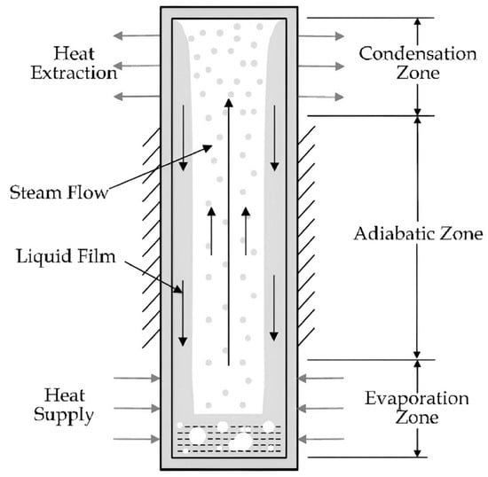 Heat pipes are increasingly playing a significant role in various industrial applications, especially in the enhancement of thermal performance in heat exchangers and the augmentation of energy savings, both of which can be achieved without external energy input [,]. Thermosyphons are being employed by many researchers in rooftop solar collectors [,,,], both on the rooftop itself [] and in photovoltaic systems, to conserve energy and reduce electrical costs []. Heat pipes have found extensive utility in diverse engineering applications, including heating, ventilation, and air-conditioning systems [], ground source heat pumps [], water heating systems [], and electronics thermal management []. Their prevalence in these domains can be attributed to their straightforward structure, exceptional flexibility, high efficiency, compact design, and remarkable reversibility [,,,]. A heat pipe, known as a thermosyphon, consists of a sealed container lined with wicking material. This container is vacuum-sealed and filled with a specific volume of liquid, as depicted in Figure 1 (adapted from Figure 1 of []). A thermosyphon heat pipe comprises three principal components: the evaporating section, the adiabatic section, and the condensing section. These heat pipes are charged with a working fluid, such as water [,,]. Thermosyphon systems operate through natural convection to circulate a fluid, typically a refrigerant, without the need for a pump. The selection of the working fluid is of great importance, as each heat pipe application requires specific temperature operating ranges. Consequently, when designing a heat pipe, careful consideration must be given to the intended temperature range through the selection of an appropriate working fluid. For low-temperature applications, working fluids such as ammonia, as well as various refrigerants like R134a [,,,], R22, and R410a [], have been employed. These working fluids are used in conjunction with compatible metals such as copper, steel, and aluminum as shell materials [,]. The primary focus of this paper centers on R410a as the coolant for cases involving filled refrigerant. This selection is motivated by the environmentally friendly nature of R410a, making it a potential candidate for replacing R134a, which currently serves as the industrial standard. To obtain a comprehensive understanding of the distinctive attributes of R410a, refer to Table 1 [].