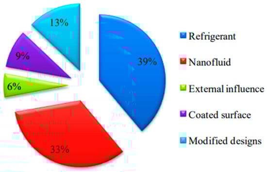 Numerous factors influence the performance of a thermosyphon. Figure 2 provides a visual representation of the experimental studies conducted by various researchers. Experimental investigations regarding refrigerants in thermosyphons dominate, as they find application in multiple fields, including external influences, coated surfaces, and modified designs. The emission of refrigerants with high ozone depletion potential (ODP) and global warming potential (GWP) has substantial environmental consequences [,]. To attain an optimized closed-loop thermosyphon design, careful consideration must be given to the choice of fill liquid, the inclination angle relative to the horizontal (θ), and the length-to-diameter aspect ratio (AR). Ong et al. [] have observed that both the fill ratio (FR) and inclination angle exert insignificant impacts on thermosyphon performance. The fill ratio (FR) denotes the liquid volume in relation to the evaporator’s volume, and it holds particular significance, as excessive liquid can lead to flooding, while insufficient liquid results in dryness. Both flooding and dryness are undesirable as they detrimentally affect thermosyphon performance. The inclination of the thermosyphon also influences its thermal performance by affecting the flow of condensate back to the evaporator section. Furthermore, proper system design and sizing are essential to ensure optimal operation, irrespective of the inclination angle. Engineering and thermodynamic considerations are pivotal in achieving energy savings within thermosyphon systems. Implementing a thermosyphon system within an industrial facility represents an effective approach to augmenting heat transfer and conserving energy, particularly in processes involving heat exchange and temperature regulation. The selection of the appropriate thermosyphon system necessitates careful consideration of several key factors that are pivotal for ensuring energy efficiency (see more details in Section 4 below).