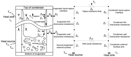 Thermal resistances and an equivalent circuit are shown in Figure 3, as detailed in Figure 2.8 of []). Specifically, Z1 and Z9 represent the heat transfer resistances associated with heating a solid surface. Z2 and Z8 denote the thermal resistances pertaining to the heat pipe wall. Z3 and Z7 characterize the thermal resistances of the wick structure, while Z4 and Z6 signify the thermal resistance corresponding to the vapor–liquid surfaces. Z5 represents the thermal resistance of the saturated vapor, and Z10 corresponds to the axial conduction thermal resistance through the heat pipe wall. The heat transfer mechanism in the heat pipe involves the ingress of heat from a heat source and its egress through a heat sink, mediated by conduction, convection, or thermal radiation. Additionally, electron bombardment or eddy currents may be utilized to heat the heat pipe, and electron emission can serve for cooling, as outlined in []. This thermal process induces a temperature difference through the evaporator and condenser walls, with thermal resistance manifesting at both vapor and liquid surfaces. The evaluation of heat pipe performance hinges on a thorough consideration of the overall thermal resistance, which has been extensively discussed in [,,]. Mathematical expressions defining the thermal resistance network can be found in Tables 2 and 3 of [] as well as in the pertinent literature []. It is important to highlight that this analysis excludes the consideration of heat transfer between vapor and liquid phases (Z4, Z6), the pressure drop across the vapor–liquid interface (Z5), the longitudinal pipe resistance (Z10), and external surface heat resistance (Z1, Z9). The total thermal resistance is, therefore, determined as follows: