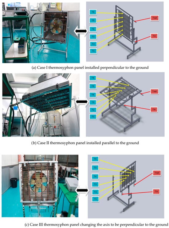 The experimental apparatus of the closed-loop thermosyphon panel installation: (a) perpendicular, (b) parallel, and (c) changing axis to be perpendicular to the ground.