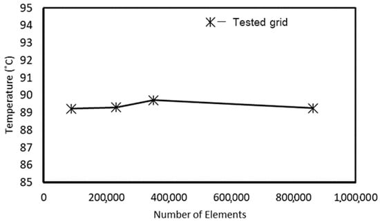 Numerical simulations were performed by utilizing a CFD solver based on double precision. The analysis encompassed two equations: one related to energy and another for the standard k-epsilon model. The criteria for model convergence were met when the residuals within the computational domain registered values below 10−6. The exploration of grid independence was centered on the assessment of four distinct mesh densities, as illustrated in Figure 6: 88, 768; 231, 804; 352, 601; and 863, 300 hexahedral elements. It was noted that the solution exhibited consistent behavior, irrespective of variations in mesh resolution. Furthermore, the standard deviation was only 0.19, confirming that additional mesh refinement would have a negligible impact on the solution. Therefore, the decision was made to employ 88,768 grids in this model to enhance computational efficiency. Figure 7 provides details regarding the grid size and type.