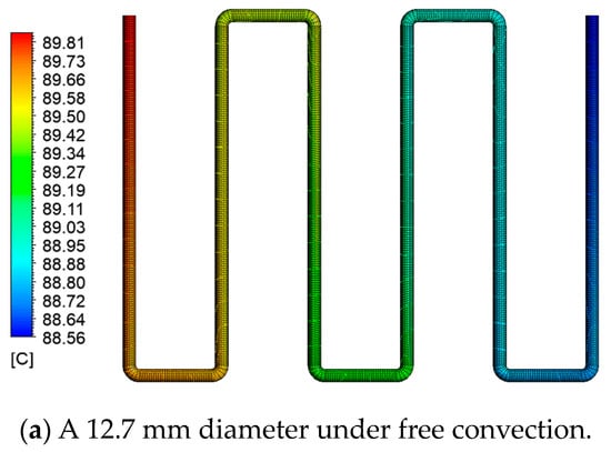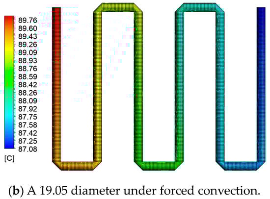 The heat and mass transfer mechanisms involved in evaporation and condensation processes in the thermosyphon are the subject of this study. Surface temperature distributions for a copper tube with a 12.7 mm diameter under free convection and a 19.05 mm diameter under forced convection conditions, with a fluid inlet temperature of 90 °C, reveal interesting insights, as shown in Figure 8 In both cases, thermal gradients confirm that forced convection results in a higher heat transfer rate () compared to free convection. It is worth noting that the temperature change (∆T) between regions T1 and T6 differs significantly, amounting to 0.64 °C for the 12.7 mm diameter copper tube under free convection and 2.42 °C for the 19.05 mm diameter copper tube under forced convection.