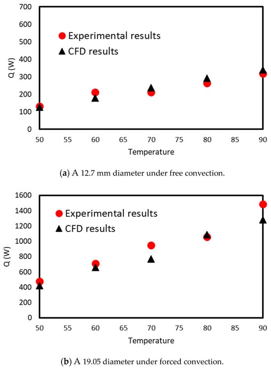 The comparison of the heat transfer rate () coupled with both experimental and CFD analyses of the conditions: (a) a copper tube with a 12.7 mm diameter of under free convection and (b) a copper tube with a 19.05 mm diameter under forced convection.