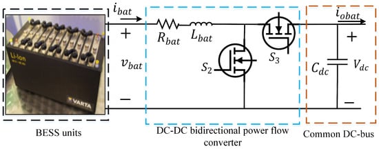 The schematic circuit diagram of the BESS, incorporating a DDBPFC, is presented in Figure 3. To derive the dynamical model, Kirchhoff’s principles are applied to the components depicted in Figure 3. Hence, this analysis establishes the following dynamical model: