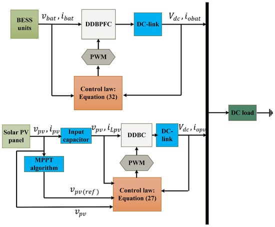In [7], a multilevel converter was introduced that utilized an optimization approach to the energy management of a battery ESS (BESS)-based single-phase hybrid SPV distributed system. Though this converter effectively achieved its control objectives, its layered structure posed practical implementation challenges. To address this limitation, an alternative approach was presented in [8], involving the connection of the DC-bus to a BESS through a dual-active-based converter. However, though this method offers relative ease of construction, it did come with certain limitations when applied in DC microgrid applications. Droop control, extensively discussed in references [9,10], serves as an efficient control method to keep a constant DC-bus voltage while assuring equitable load sharing within microgrids. However, droop controllers have a drawback in that they can compromise the accuracy of load current sharing as result of voltage drop effects caused by line impedance. This issue was tackled by a fuzzy logic gain-scheduling controller, as referenced in [11,12]. Furthermore, another fuzzy logic control strategy was proposed in [13] to oversee the voltage of the DC-bus and equalize power distribution between loads and generators. However, one potential limitation of this approach is its potential inadequacy in representing the system’s dynamics, often due to the absence of dynamical models in the controller’s design methodology. Moreover, the controllers mentioned above were typically designed based on linearized models. Consequently, they may fall short of delivering the desired control performance when operating conditions change, as noted in [14]. In contrast, the DC microgrid, due to the presence of multiple power electronics converters, is inherently complex and nonlinear. Hence, there is a growing interest in exploring nonlinear control schemes to ensure consistent performance under diverse operating conditions.
