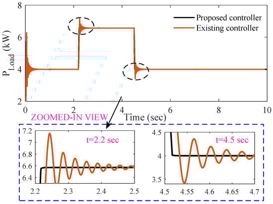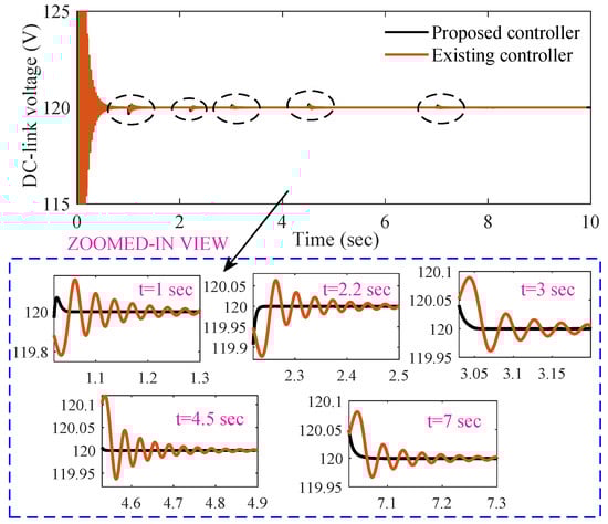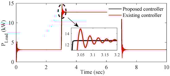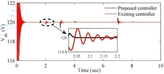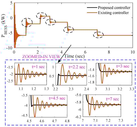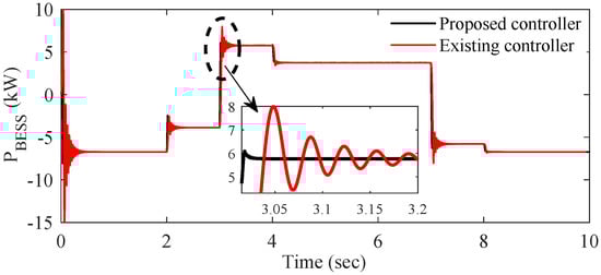 At s, there is a reduction in load demand, decreasing from 5.703 to 3.13 kW. With this change, the total power generation now exceeds the total load consumption. Consequently, the BESS shifts into a charging mode to store excess energy to keep the DC microgrid system balanced. However, at s, the SPV system returns to its regular operation, even though the load demand remains unchanged. In this scenario, the BESS utilizes the excess power generated by the SPV system to continue charging, ensuring that the DC microgrid system maintains a balanced power distribution. These responses clearly demonstrate the superior power balancing achieved by the proposed controller when compared to the existing controller, as evidenced by the stable DC-bus voltage response shown in Figure 13.