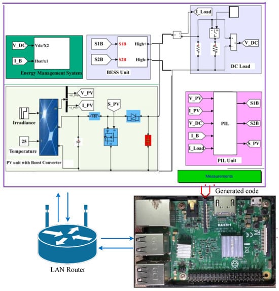 The processor-in-the-loop (PIL) serves as an experimental platform to further validate the simulated results of the proposed controller. It utilizes a Rasberry Pi 3B quad-core 64-bit microprocessor (Raspberry Pi Ltd., Cambridge, UK) development board to generate control signals for driving the converter switches. Simultaneously, the MATLAB/Simulink platform functions as the physical system. The computer takes on the responsibility of analyzing all data and generating the actual control signals for each converter on the development board. Once the control signal has been processed on the microprocessor development board, the control inputs are transmitted back to the MATLAB/Simulink platform through a PIL block, as depicted in Figure 9. The switching pulse generator then converts this signal into an analog signal. As illustrated in Figure 9, data are exchanged between MATLAB/Simulink and the development board via an Ethernet connection. It is worth noting that the parameters used in this experiment match those employed in the previous simulations. In the following analysis, the performance of the controller is evaluated under varying load demands and fluctuations in SPV unit power generation.
