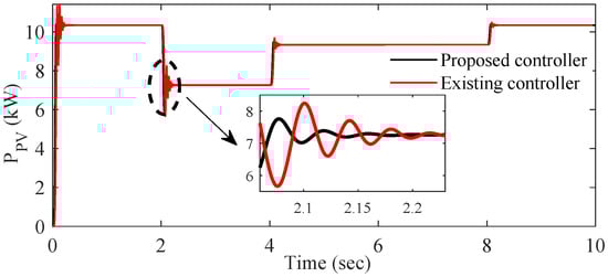 In the initial stage of the experiment, it is assumed that the SPV unit is operating under standard conditions, generating an output of 10.3 kW from to s, and there is a load demand of 3.13 kW until s. These conditions are illustrated in Figure 10 and Figure 11.