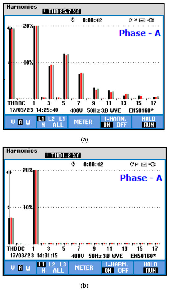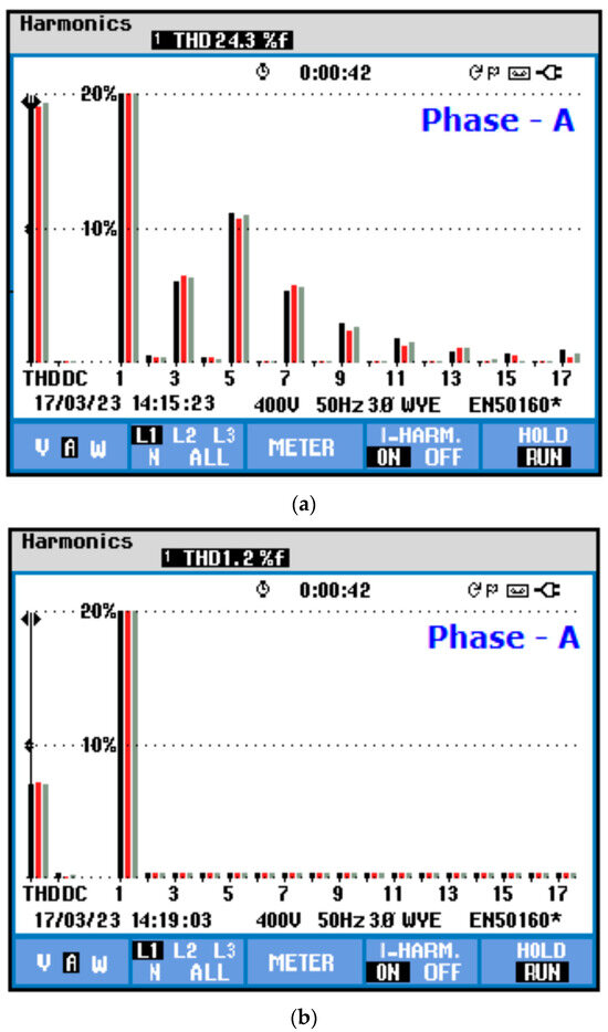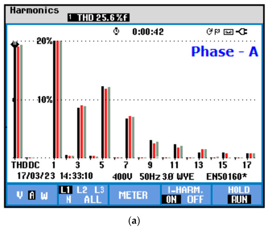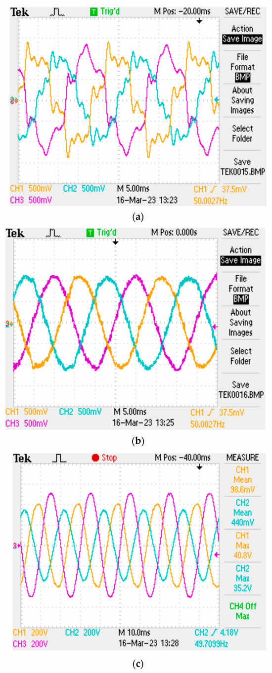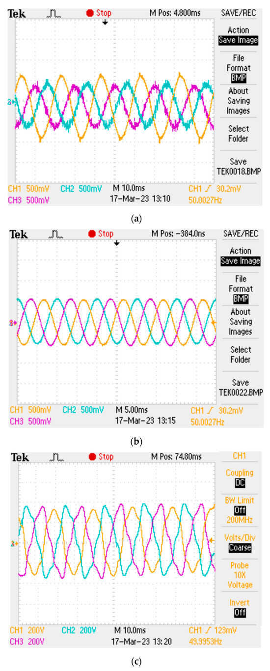 6.3. Case 3: Distorted Voltages with Unbalanced Loads