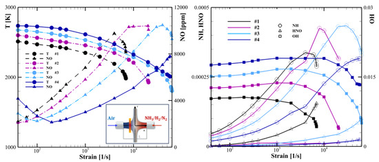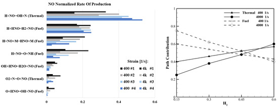 Figure 1 shows the temperature and NO concentration trends (on the left) as well as the NH, HNO, and OH mass fraction trends (on the right) with respect to the strain rate for the four mixture compositions studied in this work. The increasing hydrogen content in the mixture influences the maximum strain limit that the flame can sustain before it quenches. The flame of the mixture with 15% hydrogen volume (high ammonia content) is extinguished at 7k 1/s, whereas this value increases by increasing the hydrogen content to about 60k 1/s in the mixtures with 45% (3) and 60% (4) of hydrogen. The temperature exhibits a decreasing trend with increasing strain for all the compositions, whereas NO increases almost up to the quenching. Mixture 1 shows a lower temperature and higher NO concentration at the same strain value; however, mixtures 2 and 3 have a higher NO peak of 10% because it survives at larger strains. This behavior can be analyzed through the radicals trend and the pathways study shown in Figure 1 and Figure 2, respectively. Figure 2 reports normalized NO formation rates for different reaction pathways [44], emphasizing the role of each pathway at two strain rates of the mixtures [45]. As the strain and the ammonia composition increase (hydrogen content decreases), the thermal NO formation path becomes less significant due to the lower OH production, while the fuel pathway gains prominence due to the increase in NH and HNO concentrations. Consequently, even with a decreasing thermal path contribution, NO levels reach approximately 10,000 ppm through the dominant fuel pathway before quenching for all mixtures except for the mixture with 60% hydrogen, which reaches 8000 ppm due to the fuel path having a lower impact on the NO formation.